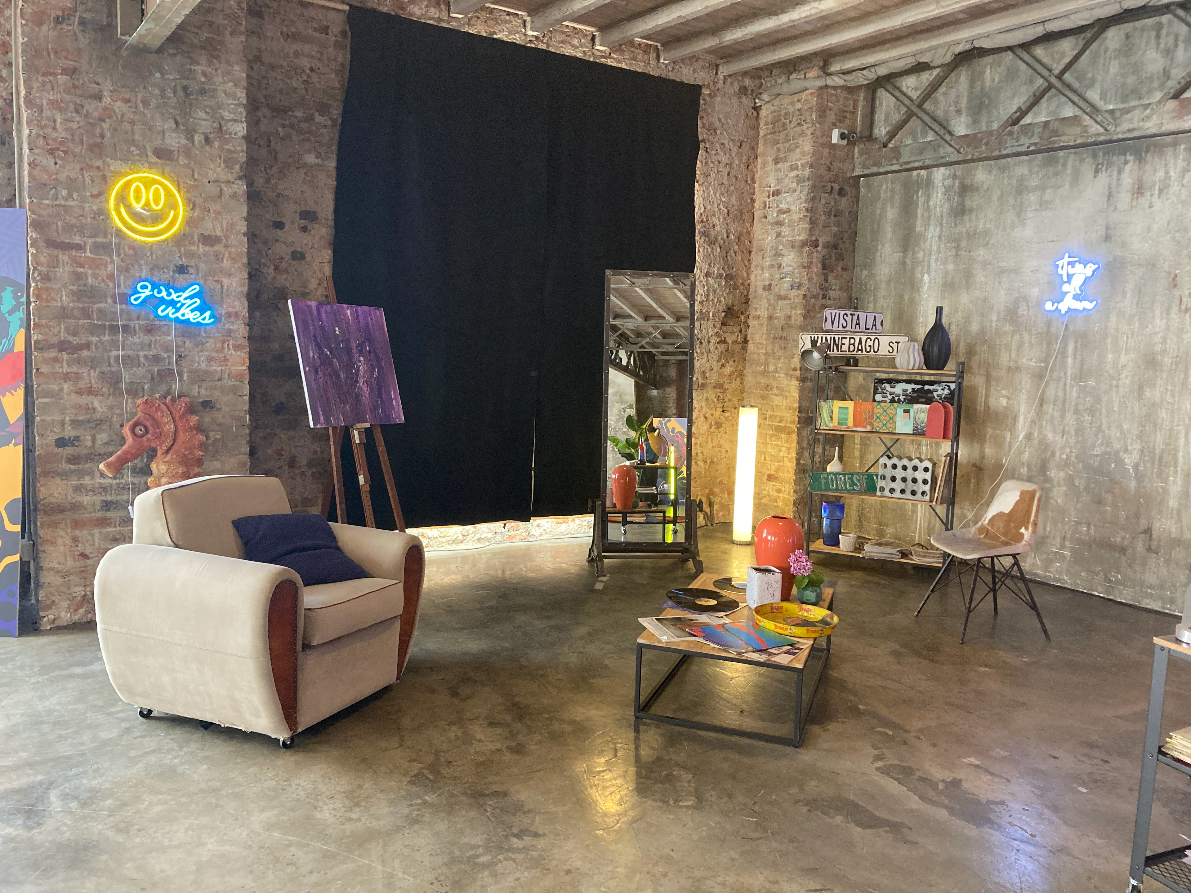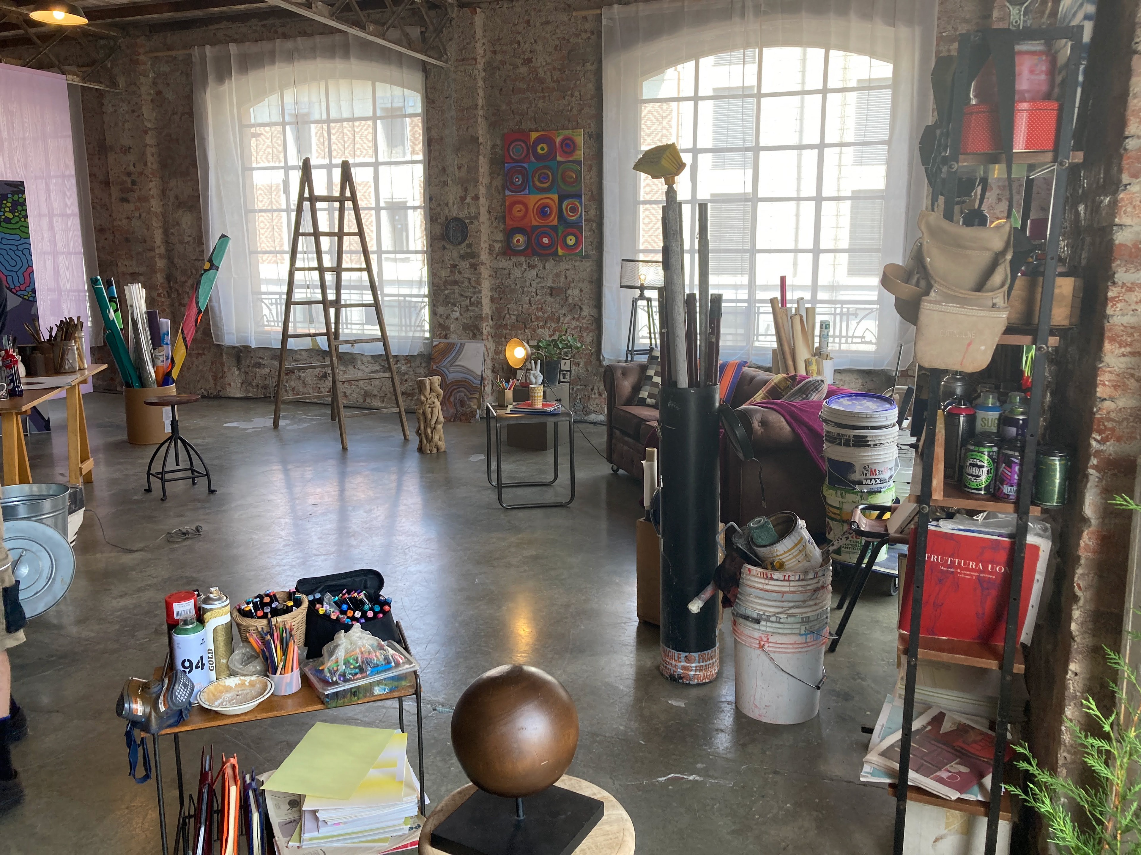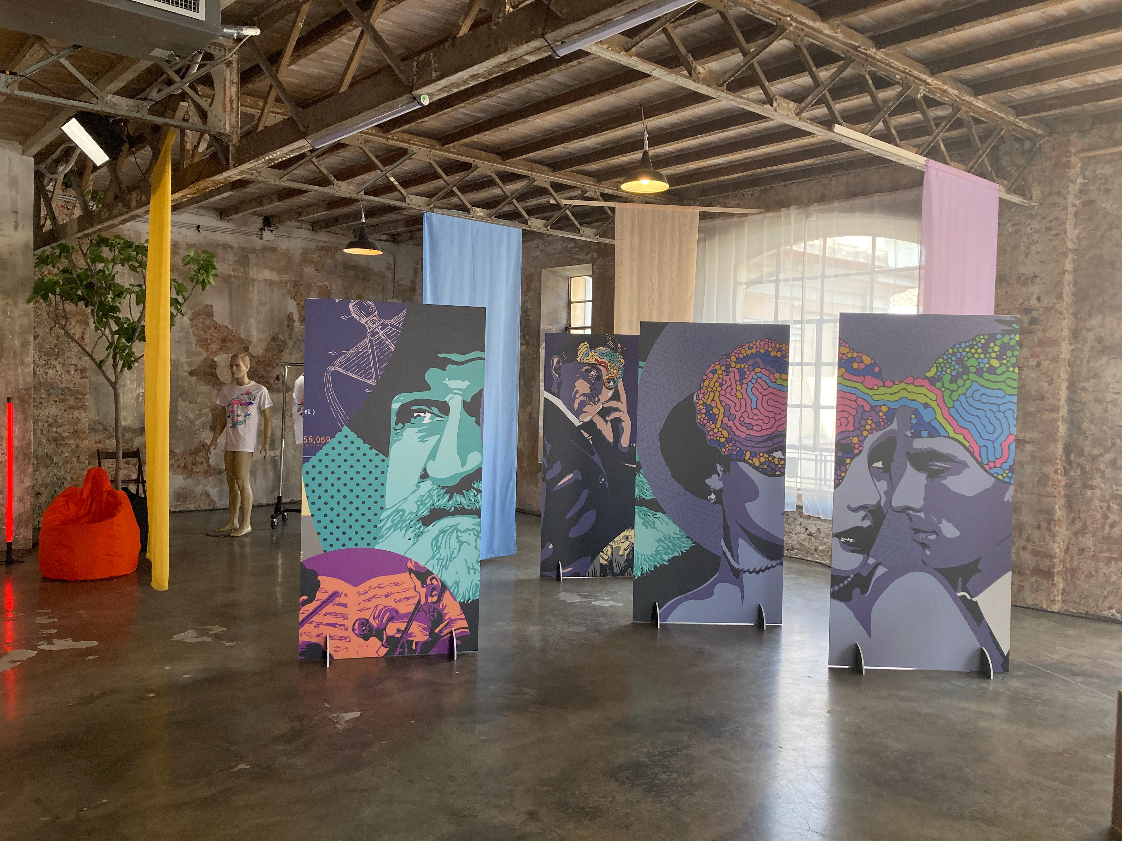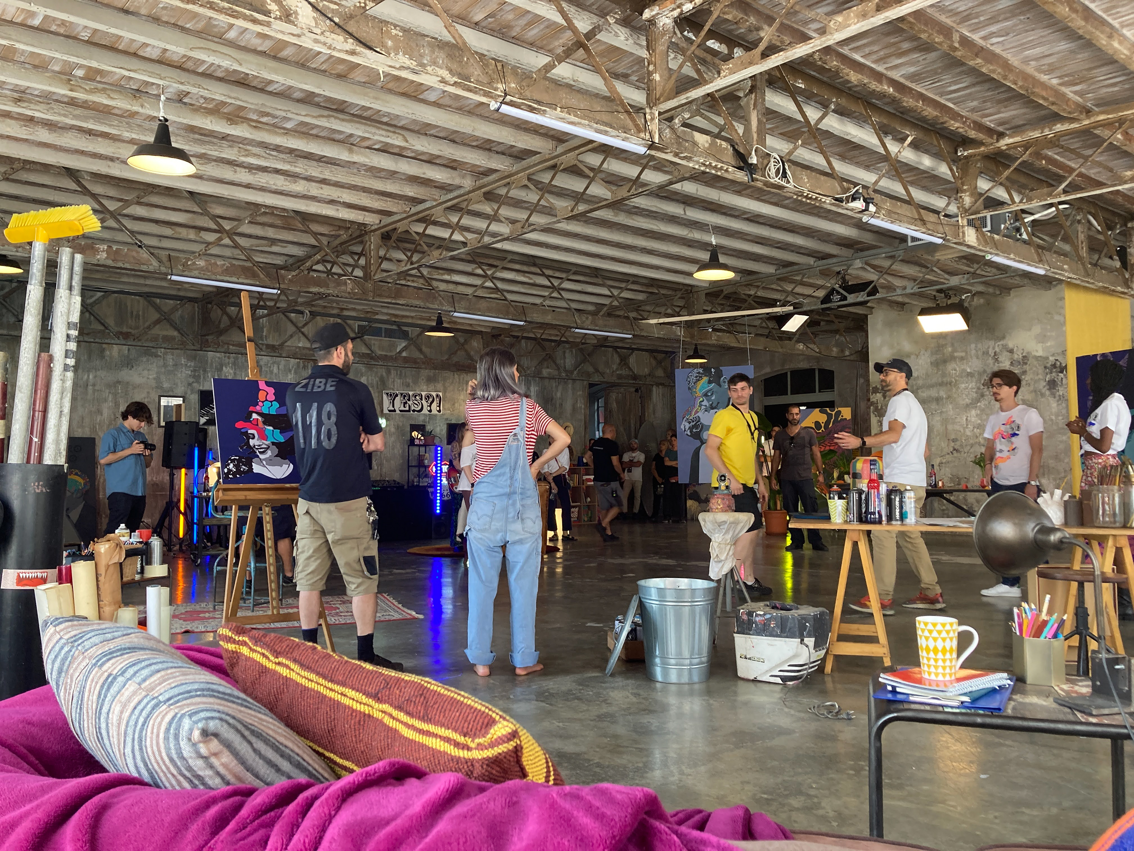 Creation of three different environments in a single space: a recording studio, a street artist's atelier, and an art exhibition.